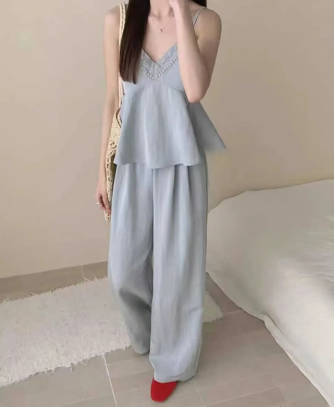 輕盈夏日感一套就能搞定出門穿搭來自韓國設計師品牌的精緻套裝細緻蕾絲細節結合修身剪裁讓整體線條自然柔和透氣涼感面料讓你一整天舒適自在背心下擺微A設計修飾腰腹搭配高腰寬褲拉長比例不潤是渡假上班還是日常約會都優雅又好搭&正韓空運&限量到貨&套裝組合:蕾絲細肩背心+寬褲&顏色選擇:深藍/潛藍&材質:韓國布料親膚不悶熱&尺寸建議:Free size(M~L可穿)
